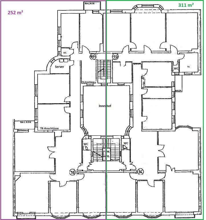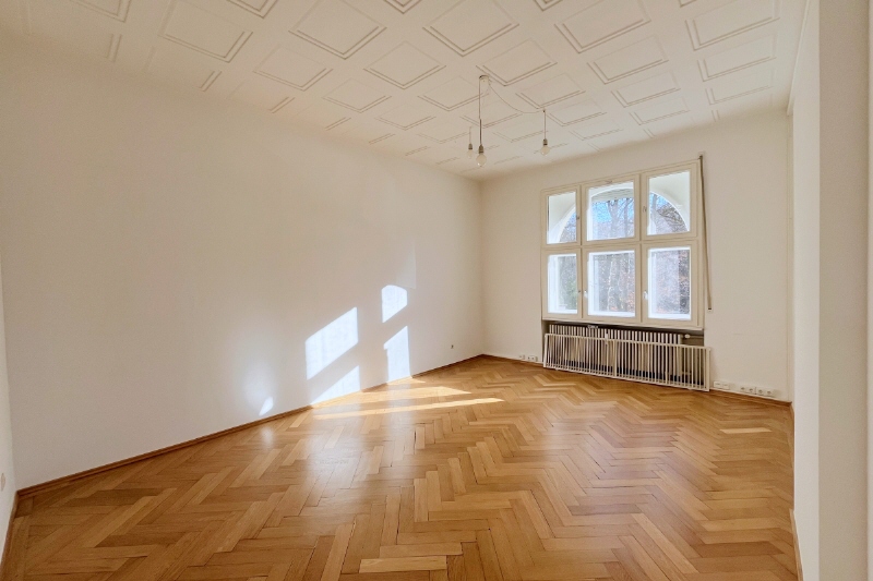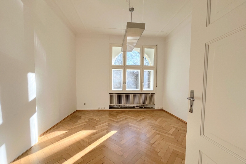 Im Rahmen der aktuellen Modernisierung wurden historische Details sorgfältig mit zeitgemäßem Komfort kombiniert: Die Sanitärbereiche werden komplett erneuert und der Parkettboden wurde aufgearbeitet, um den ursprünglichen Charakter zu bewahren. Die Fläche präsentiert sich damit als modernisierte Büroeinheit mit besonderem architektonischem Flair.