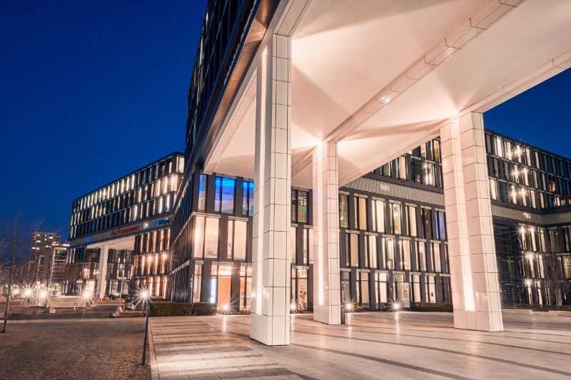Der attraktive Neubaukomplex wurde von einem der namhaftesten deutschen Architekten, Hadi Teherani, entworfen. Das effiziente und flexible Gebäude bietet neben 10 Eingangsbereichen auch 4 begrünte Innenhöfe mit insgesamt knapp 5.000 m² Fläche. Für die nachhaltige Bauweise (z.B. die Kühlung mit Grundwasser) wurde das Gebäude mit einer LEED Zertifizierung in Gold ausgezeichnet.