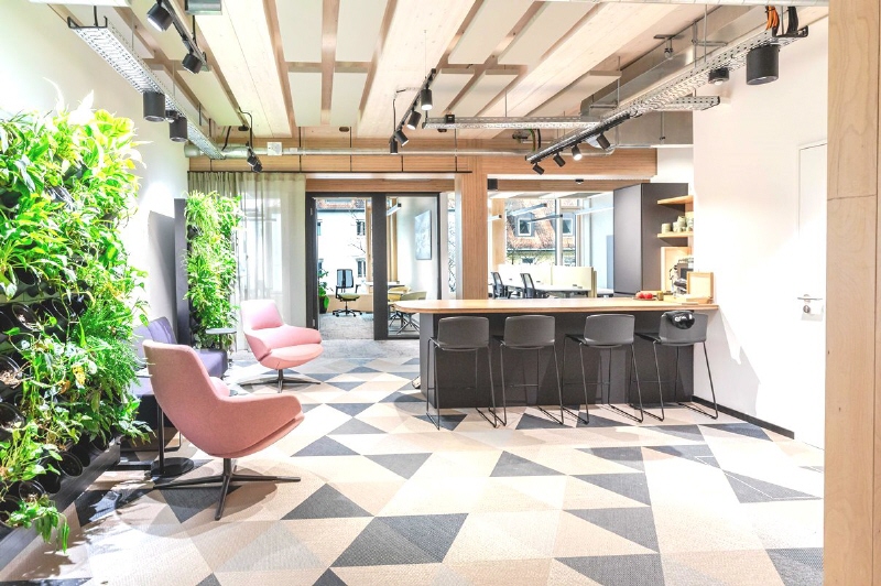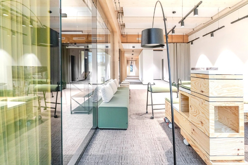 Das zukunftsorientierte Holz-Hybridgebäude definiert die Arbeitswelt mit einem Mix aus nachhaltiger Bauweise, innovativen Technologien und einem inspirierenden Baukonzept neu. Im kompletten Gebäude werden Elemente aus der Natur, Holzmaterialien, helle Farben und Pflanzen kreativ kombiniert, um eine Wohlfühlatmosphäre am Arbeitsplatz zu schaffen. Herzstück des Gebäudes ist das doppelgeschossige Foyer und der begrünte Innenhof im 1. Obergeschoss, sowie Loggien und eine Dachterrasse für die Nutzer der oberen beiden Etagen. Dem Mieter stehen drei frei wählbare Gestaltungslinien in den Officebereichen zu: Pure, Wood oder White und maximalie Flexibilität in der Raumaufteilung. Das Smart-Office bietet zudem eine Anpassung der Beleuchtungsintensität in Abhängigkeit der aktuellen Belegung, Highspeed-Internet im gesamten Haus sowie Ladesäulen für E-Autos und E-Bikes. Ein modernes Gastronomiekonzept mit Außensitzplätzen ist geplant.
