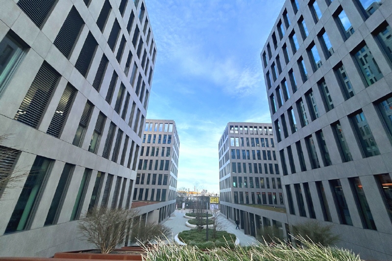 Das 2019 fertig gestellte Bürohaus Kap West ist ein echtes Highlight, allein schon durch seine zwei eigenständigen Baukörper, die jeweils um einen aufgesetzten Turm erweitert wurden und spannende Aussichten bieten. Der markante Zugang am Fuß der Friedenheimer Brücke mit großzügigem Vorplatz bietet ein repräsentatives Entree. Die sehr ansprechend gestaltete Büroeinheit im Nordturm verfügt über eine eher offene raumaufteilungm, die den Wünschen des kommenden Mieters noch angepasst werden könnte. Begrünte Innenhöfe mit Sitzgelegenheiten unter Bäumen stehen zur gemeinschaftlichen Nutzung zur Verfügung.