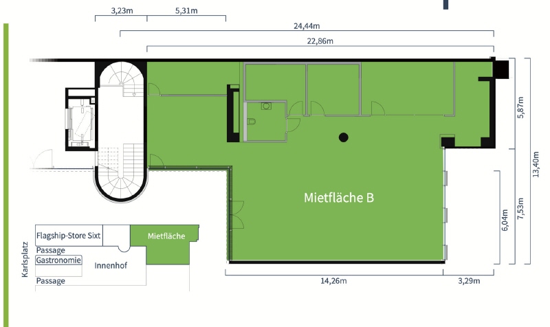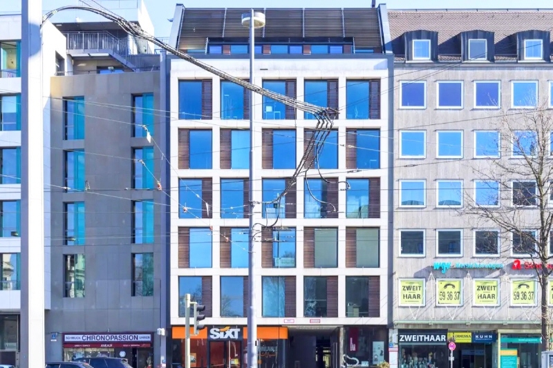 Das Gebäude wurde im Jahr 2008 komplett saniert und um einige Etagen erweitert. Nun verfügt das chice Geschäftshaus über einen repräsentativen Eingangsbereich und Innenhof sowie eine zeitgemäße, moderne Glasfassade. Die Retailfläche befindet sich im ruhigen Innenhof und besticht vor allem durch bodentiefe Fenster sowie eine hohe und offene Decke, die den industrial Style unterstreicht. Es sind unterschiedlichste Nutzungen vorstellbar, über Büro, Showroom oder Retail.