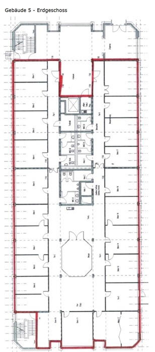 Das attraktive Bürohaus, erbaut 1982, ist in sechs Gebäudeteile aufgeteilt. Davon sind drei Abschnitte reine Bürogebäude, ein Teilobjekt bildet den Empfangsbereich. Die beiden rückwärtigen Gebäude werden als Labor-/Produktions- und Werkstattflächen genutzt. Die Räume sind sehr hell und entsprechen den derzeitigen Anforderungen an ein modernes Bürogebäude. Die Raumaufteilung kann den Wünschen des kommenden Mieters angepasst werden.