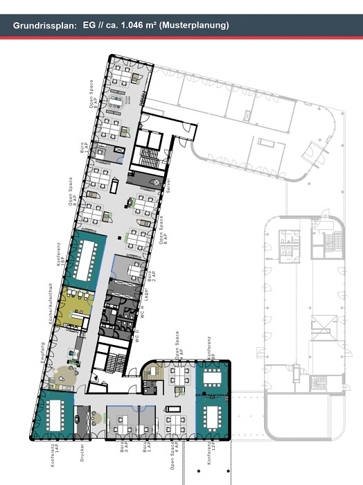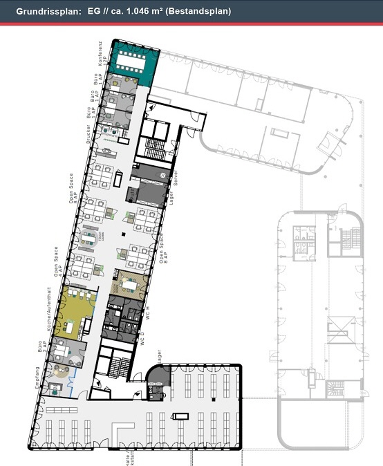 - Raumhöhe von ca. 2,80 m in den Büros, 2,60 m in den Fluren (abgehängte Decke)