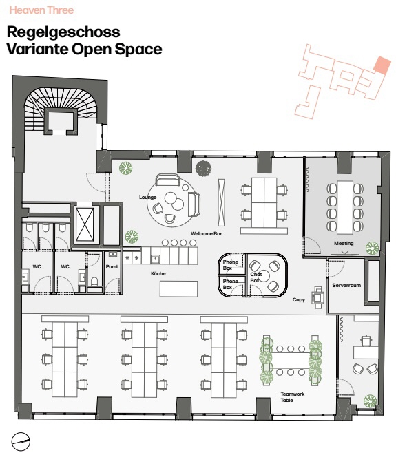 Das HEAVEN THREE präsentiert sich als revitalisiertes Bestandsgebäude in Neubau-Qualität mit markanter Ziegelsteinfassade und loftartigen, bodentiefen Sprossenfenstern. Der industrielle Charakter wird durch extrahohe Decken und die charmanten Vintage-Details der dunklen Fensterrahmen unterstrichen. Als architektonisches Unikat mit großzügiger Terrasse zum Innenhof bietet das Gebäude eine unverwechselbare Adresse im Quartier und eignet sich ideal für Individualisten und Single-Tenant-Nutzer.