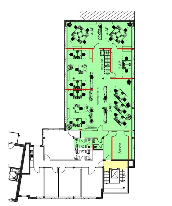 - 6 Stellplätze können in der hauseigenen Tiefgarage angemietet werden (à € 75,00 zzgl. Nebenkosten von € 5,00 und gesetzl. MwSt.)